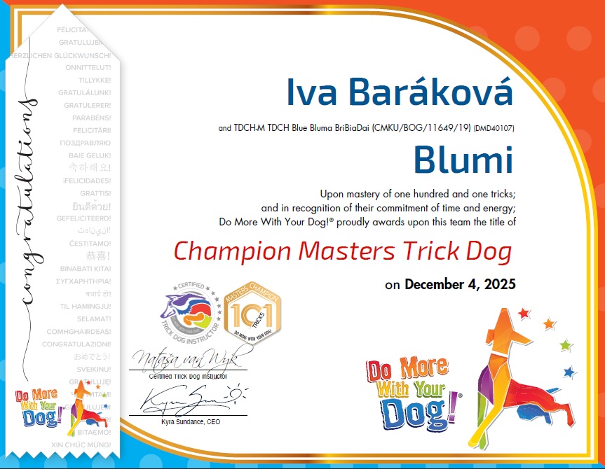 Blumi získala titul TRICK DOG CHAMPION (TDCH) – jako první belgický ovčák v ČR a jako 6. pes v ČR vůbec – naskrz plemeny. ![]()